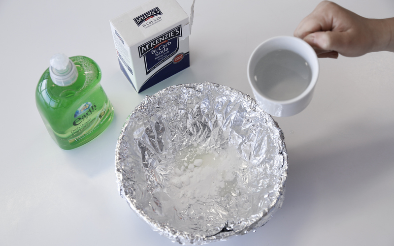 A natural chemical reaction called an “ion transfer” is created when you combine aluminium foil with salt and baking soda which naturally cleans metals.